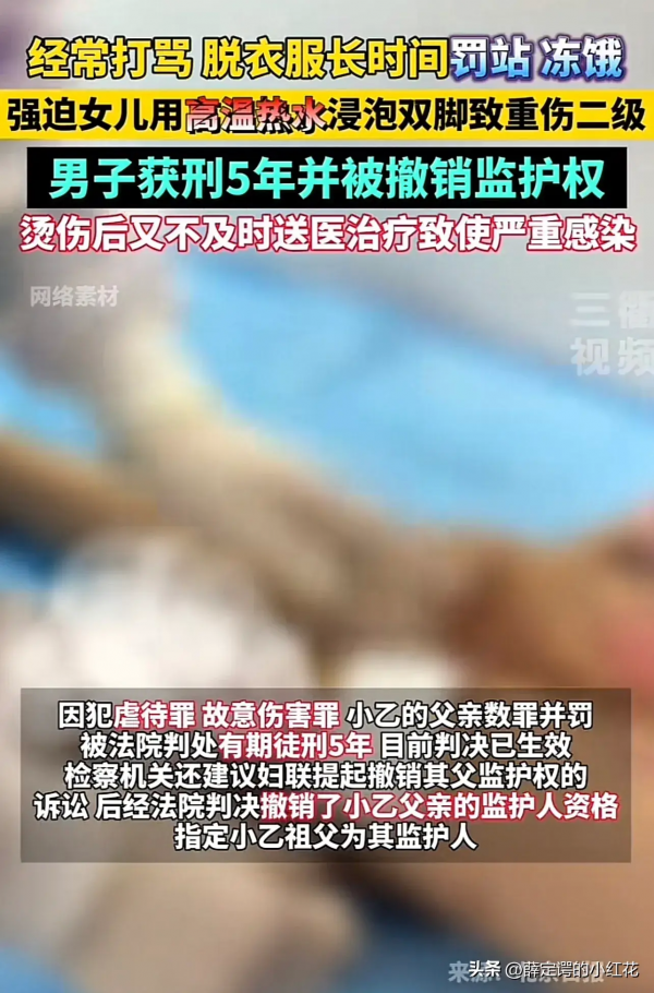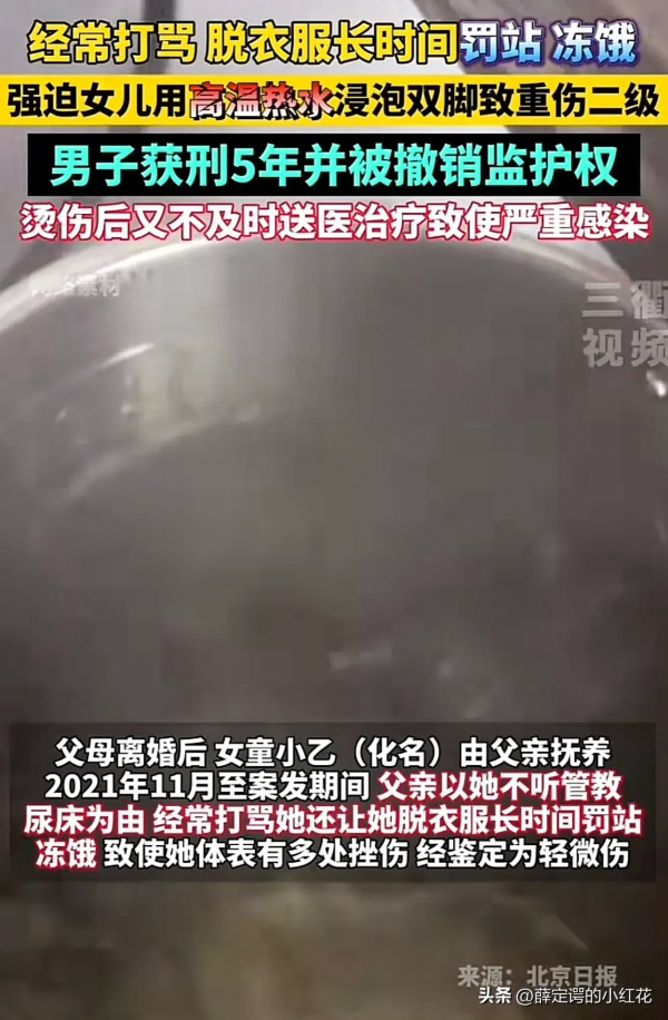 除了打骂以外,这位这位父亲的做法更加过分。要求女儿脱光衣服长时间罚站,动不动就不给女儿饭吃,还强迫女儿用高温的热水洗脚,导致小乙重伤二级。