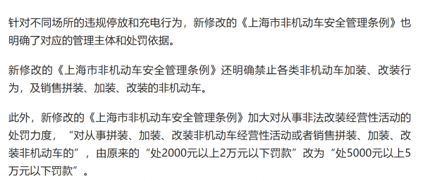 车主要注意,第一种行为:改装电动自行电动车为2024年六月1日起:《上海市非机动车安全管理条例》实施,其中明确加强对电动自行车"拼加改"的源头治理,对于违规改装,加装非机动车的行为,规定相应法律责任,商家可面临5千以上,5万以下罚款。车主如果使用改装电动自行车上路,可面临200以上500以下的罚款。