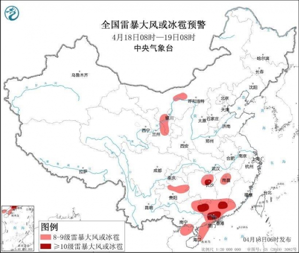预计4月18日08时至19日08时,贵州中东部、湖南东北部、江西北部、广西东部、广东、海南岛北部、宁夏、内蒙古西部等地的部分地区将有8-10级雷暴大风或冰雹天气,其中,湖南东北部、广西东北部、广东中北部等地的部分地区将有10级以上雷暴大风,局地风力可达11级以上;贵州东北部、湖南、江西北部和南部、云南东南部、广西中东部、广东、福建南部、海南岛北部等地将有小时雨量大于20毫米的短时强降水天气,其中,湖南北部、江西北部、广西东部、广东等地的部分地区最大小时雨量大于50毫米,局地可达80毫米以上。