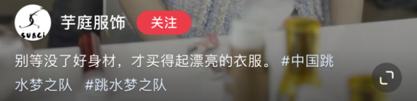 公开信息显示,芋庭服饰成立于2022年10月,注册资本200万元,注册地为上海市奉贤区。成立不到半年,2023年3月,其社交媒体账号官宣自己成为"中国国家跳水队时装官方合作伙伴"。