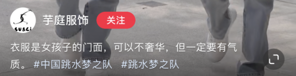 近日国货女装公司芋庭服饰引发关注,该品牌社交媒体账号上传了多条国家跳水队女队员出镜拍摄的广告片,播放量比较高的几条宣传视频中全红婵、陈芋汐穿着"小香风"马甲搭配牛仔裤。
