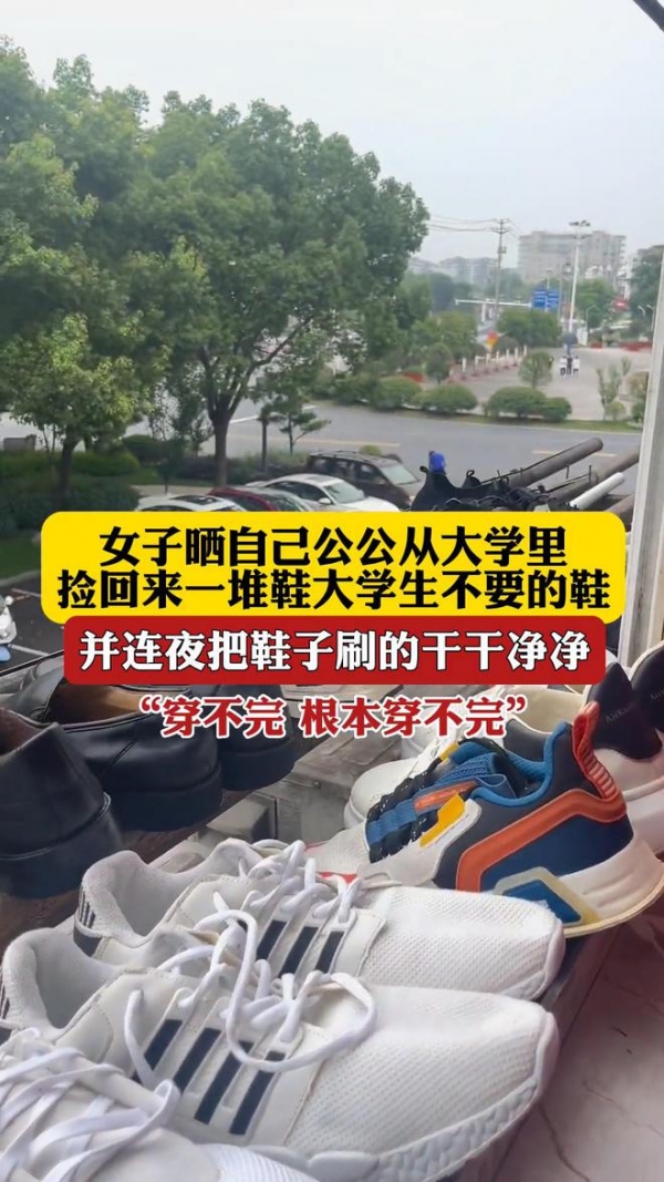 视频画面中女子的公公从大学里捡回来了一堆的鞋,都是大学生们离校之际丢弃的,他先是仔细地检查每一双鞋子,挑选出那些还能穿的鞋子,然后将它们打包带回家,随后又连夜用水和肥皂手洗每双鞋子。