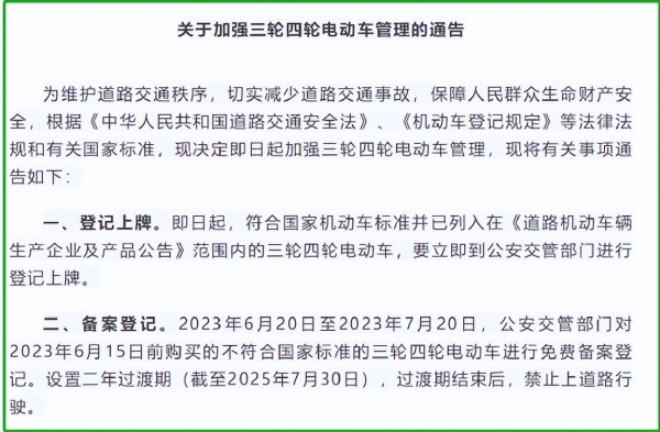 注意:已经登记备案的违规电动三四轮车,可以使用至2025年7月30日。
