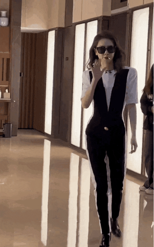 戚薇身穿黑白拼接连体套装,带着墨镜含着棒棒糖,霸气走来气场全开。