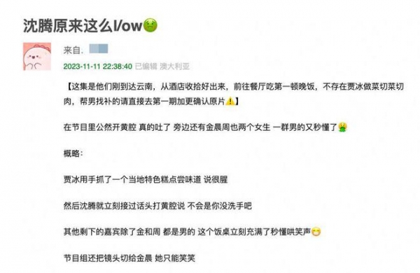 有网友发现,沈腾在该综艺节目中在女星面前公然开黄腔,引起了观众的不满。在节目中,贾冰尝试当地特色糕点时表示其味道很腥,随即沈腾便用不当的言语开玩笑说:"不会是你没洗手吧。"