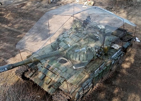 乌克兰战场上加装有防护网的坦克