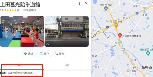 与此同时,照片中还有一处极其隐蔽但却信息量巨大的看点,那就是训练场中为模拟巷战而搭建的街道和建筑物。在建筑物外部的招牌上,赫然出现了"莒光跆拳道馆"这几个字,就连招生报名的电话号码都被惟妙惟肖地还原了出来。那么,这座跆拳道馆在哪里呢?查询电子地图后即可发现,这家名为"上田莒光跆拳道馆"的武馆就在台湾省桃园市杨梅区。好吧,为了尽可能地模拟出攻台之战可能面对的真实场景,解放军对训练场地的建造和搭建还真是无比的精益求精,着实令人佩服。从中也不难想象,针对可能在攻台过程中出现的巷战课题,解放军进行了何等深入的研究和高强度的训练。