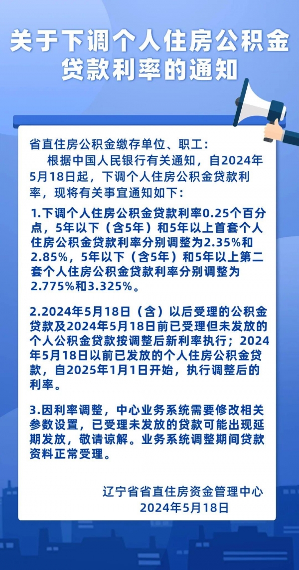 一、自2024年5月18日起,下调首套个人住房公积金贷款利率0.25个百分点,即五年以下(含五年)首套个人住房公积金贷款利率由2.6%下调至2.35%,五年以上首套个人住房公积金贷款利率由3.1%下调至2.85%。