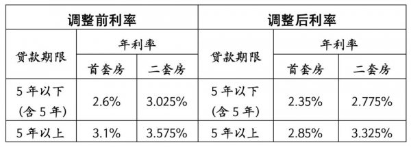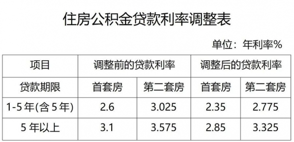 5年以下(含5年)首套个人住房公积金贷款利率由2.6%下调为2.35%,5年以上首套个人住房公积金贷款利率由3.1%下调为2.85%。
