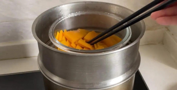 1.首先准备一个老南瓜,削去外皮后,切成薄片,再放入蒸锅里,开大火蒸熟。
