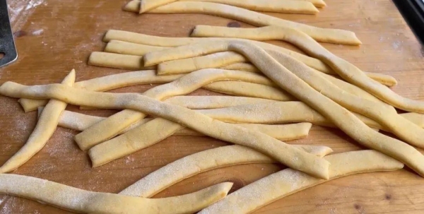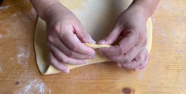 9.接着又用刀将面皮切成这样细细长长的条状。