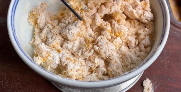 6.少量多次往里加入面粉,边加边搅拌,直到变成这样的絮状,搅不动为止。