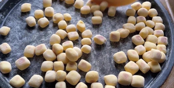 12.将小剂子倒进一个无水无油的平底锅中开小火慢慢翻炒,切记一定不要放油。