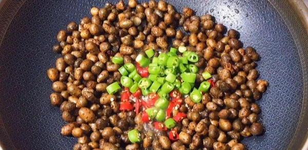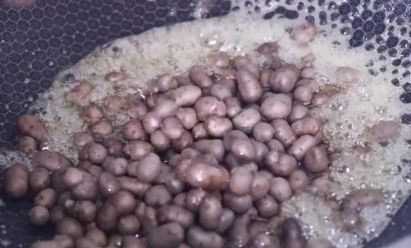 4.山药豆蒸好出锅,起锅烧油,油热倒入山药豆,开大火煸炒,炒干水分,炒至表皮发焦。