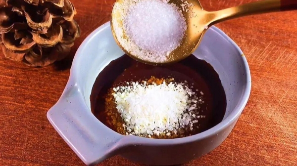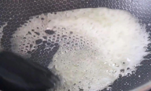 3.锅中倒一碗清水,再倒一碗白砂糖,开小火慢慢熬煮,将白糖熬至融化,直到这样冒密集小泡为止。