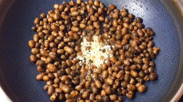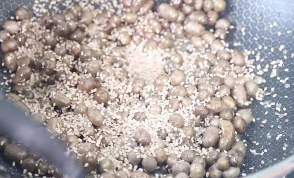 5.接着又倒入一大把白芝麻,开小火不停翻炒,炒匀炒出香味,即可出锅。