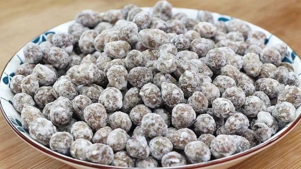 4.倒入山药豆,混合糖浆翻拌均匀。