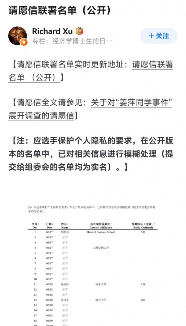 39位阿里巴巴全球数学竞赛决赛入围者向竞赛组委会发出公开信,质疑姜萍造假,要求组委会公开姜萍和王闰秋预赛答卷,进行独立调查。