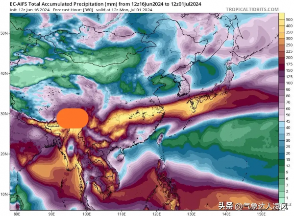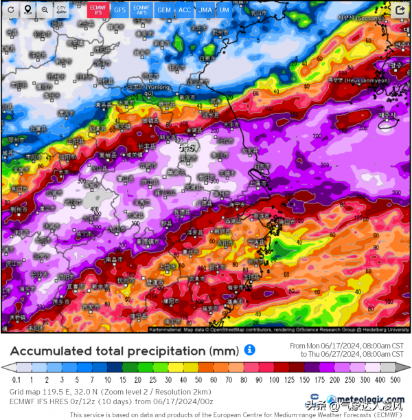 而从数值给出的远期预报来看,长江中下游的降雨至少要持续到7月上旬才会明显减弱,在此之前,湖南北部、湖北南部和东部、安徽南部、江苏南部将频繁出现强降雨。下图为未来15天的累积雨量预报,可以看到上述地区的累积雨量基本都在300-500毫米,长江干流沿线地区在500毫米以上。