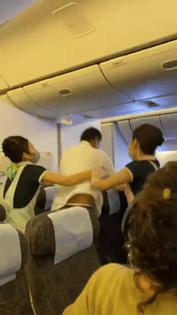 一开始,机组人员曾设法平息了紧张画面,但坐在座位上的男子跳起来又一次挥拳。