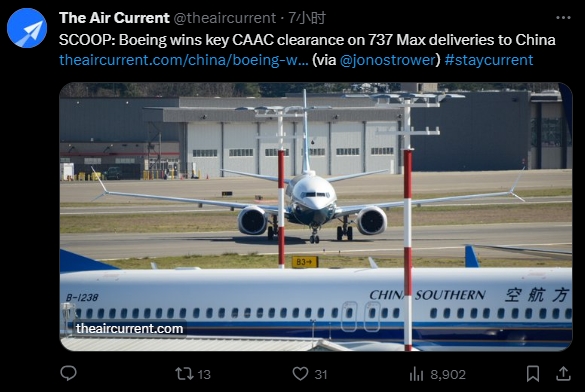 (观察者网讯)据路透社和航空业媒体《气流》杂志(The Air Current)12月20日报道,美国波音公司已经获得了中国航空监管机构的一项关键批准。这意味着,在暂停交付四年多后,波音公司距离恢复对华交付737 MAX系列飞机"又近了一步"。
