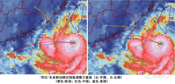 前期预报中美日偏向于不登陆的近海西南行甚至打转,欧洲倾向登陆后深入,近期预报相互有所靠近,欧洲登陆点向西南方向调整,登陆后不再西北行而是西行,中美日的也开始向沿海甚至登陆靠近,未来可能会进一步靠近,直至临近沿岸时大家终将统一起来。可以用下图来理解: