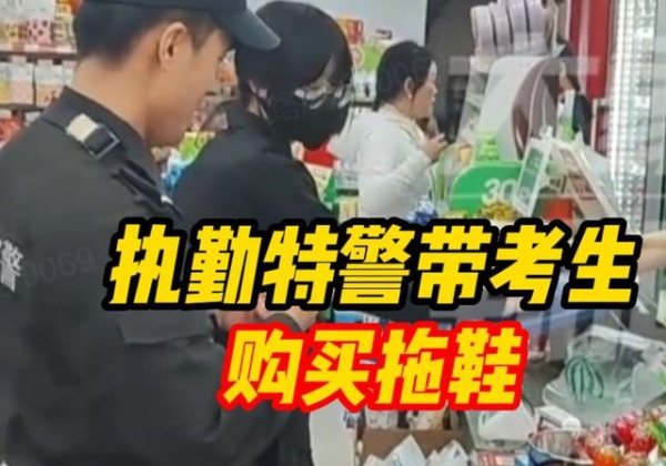 眼看考试时间临近,考生面临无法进入考场的困境。就在这紧要关头,现场执勤的特警迅速采取行动,带着考生奔赴附近的商店购买拖鞋,并第一时间护送其返回考场。