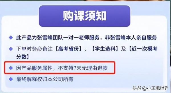但是张雪峰此次售卖的产品"因服务属性,不支持7天无理由退款",这是让那些冲动消费的家长毫无退路啊。