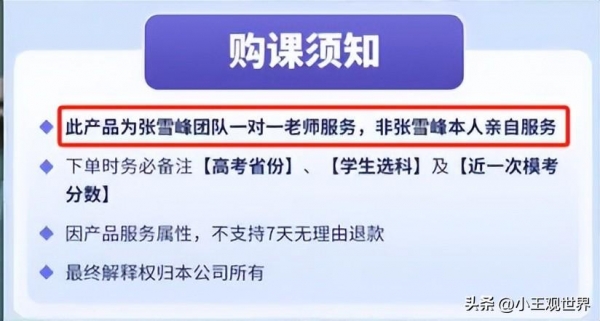 很多家长愿意花2万购买这个课程服务,基本上都是冲着张雪峰本人去的,但是这次志愿服务课程须知中专门标注"此产品为张雪峰团队一对一老师服务,非张雪峰本人亲自服务",说实话,还怪贴心的,专门给家长挖了个坑。