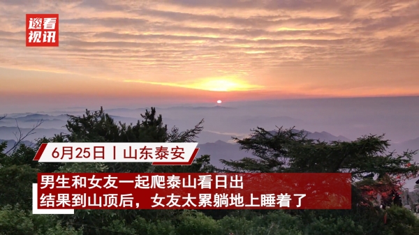 6月25日,山东泰安,男生和女友一起爬泰山看日出,结果到山顶后,女友太累躺地上睡着了。不料女友睡得太香,迟迟没有醒来,男生也叫醒女友,于是女友和日出完美错过。