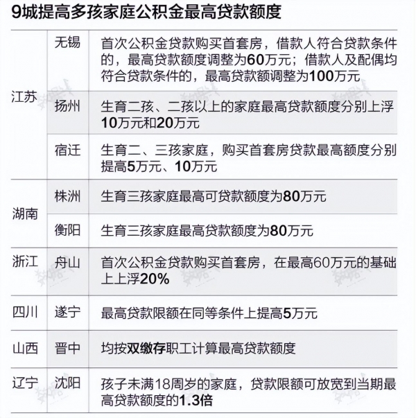 三孩时代已经到来,许多城市提高了三孩家庭的贷款额度,满足人们的住房需求。江苏无锡,多子女家庭买房申请公积金贷款的,最高可以发放100万的公积金贷款。扬州、宿迁分别将二孩和三孩家庭的最高贷款额度提高10万、20万和5万、10万。湖南株洲和衡阳对三孩家庭的最高贷款额度均为80万元,以1万左右的房价来看,100万的房子,如果能申请80万的公积金贷款,买房人自己负担20万的首付就能买房了。在四川遂宁,多子女家庭最高贷款额度在同等条件下提高5万元。