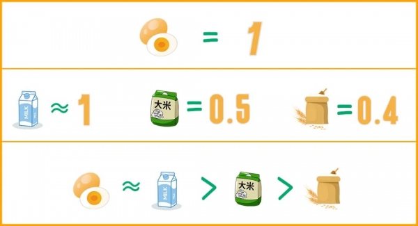 假设蛋白价值最高的鸡蛋为 1,牛奶蛋白价值接近 1;