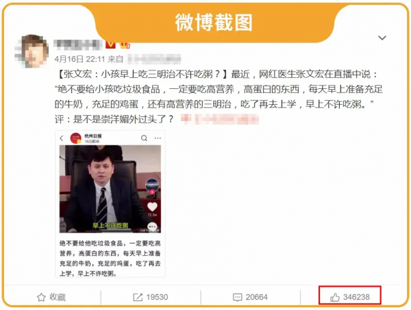 张文宏曾在一次讲座时,一句"孩子早餐不许吃白粥"引发热议。他本人甚至被 diss 崇洋媚外。