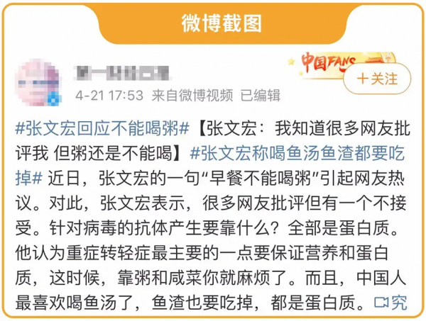 张文宏医师下场回应,"我知道很多网友批评我,但粥还是不能喝"。