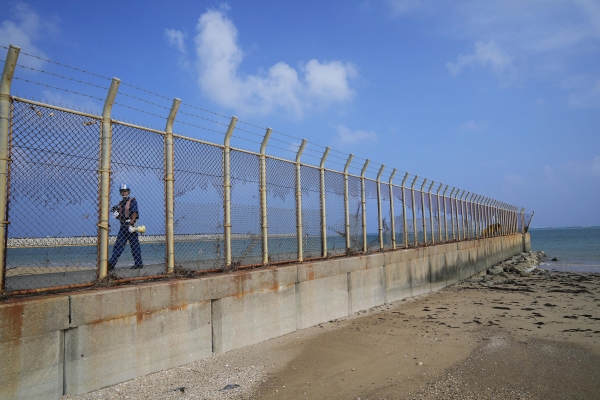 当地时间2023年9月4日,日本冲绳,名护市边野古附近,一名保安站在围栏后面监视施瓦布营地附近的建筑工地。日美政府1996年商定,把位于冲绳县宜野湾市的普天间美军基地搬迁至该县名护市边野古地区,在距陆地两公里的珊瑚礁上建设新的美军基地,需要填海造地并新建两条飞机跑道。冲绳民众对此表示强烈反对,要求美军基地彻底迁出冲绳。