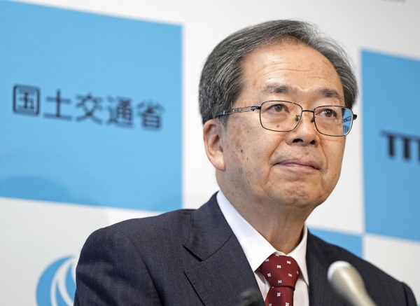 当地时间2023年12月26日,日本东京,日本国土交通大臣齐藤铁夫出席记者会。日本国土交通大臣齐藤铁夫当天通知冲绳县政府,将于28日代为批准美军普天间基地搬迁至名护市边野古相关工程设计变更计划。