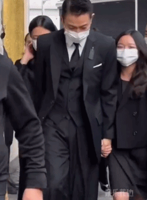 虽然三位都戴着口罩,但是面部神情都很凝重。刘德华头发梳得整整齐齐,面容难掩憔悴,朱丽倩的眼神也很哀伤,女儿刘向蕙的表情很懵懂。