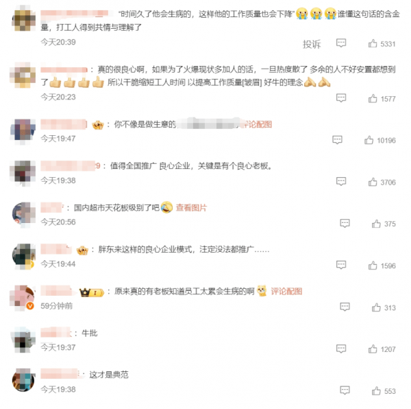 对此,网友热议纷纷:"打工人得到共情与理解了""国内超市天花板级别了吧""值得全国推广 良心企业,关键是有个良心老板"......
