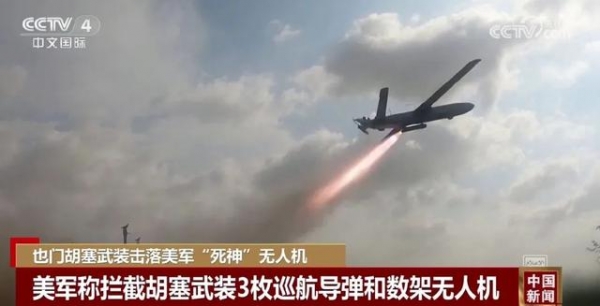 事件发生后,胡塞武装发布了一段视频,视频画面显示,一架无人机被一枚地对空导弹击中,随后起火并坠落。