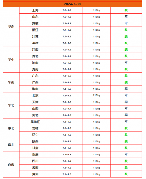 经过几天的下跌调整之后,华东区猪价降至7.6-7.9元,华中区猪价降至7.5-7.8元,华南区猪价虽然最高价还在8.2元,但最低价已经下探至7.4元了,华北区猪价尚且稳定在7.4-7.8元,东北区猪价跌至7.2-7.5元,西南区猪价下跌至7.3-7.5元。