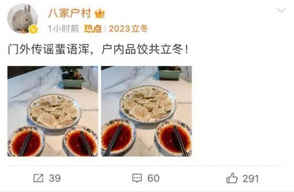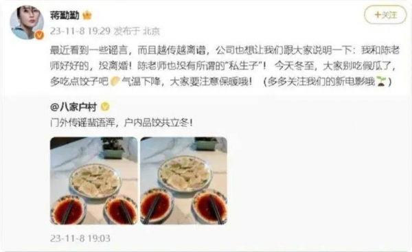 近日,突然传出实力派演员陈建斌出轨并有私生子的爆料,互联网瞬间炸了锅。11月8日恰逢立冬,当天晚上,陈建斌晒了一盘饺子和双份醋碟筷子的照片,用一句"门外传谣蜚语浑,户内品饺共立冬!"辟谣与蒋勤勤婚变的传闻。