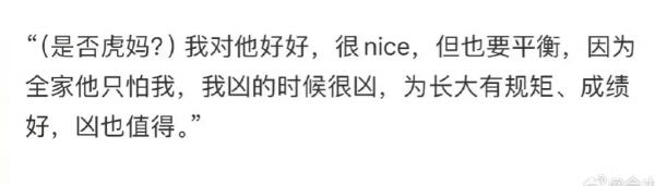 被问到:是否是虎妈?她称对小海绵很好,很亲切,但也要保持平衡,因为全屋子里小海绵只惧怕她,她在严厉时很严厉,为了让孩子长大后有规矩、成绩好,严厉也是值得的。