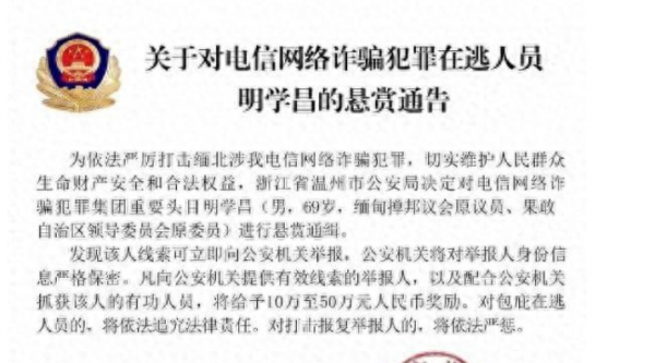 中国浙江温州警方最近发布了一则通缉令,对缅北地区的电诈集团头目进行悬赏通缉,奖金最高达50万元。这次被通缉的主要头目明学昌曾在缅甸担任重要职务,是该地区的政治人物,同时也是"四大家族"中"明家"的最高头目,长期操控着该地区的电诈犯罪活动。据悉,明学昌早年涉足毒品犯罪,后来转向电诈犯罪,并通过建立诈骗园区和外包方式控制电诈公司来掩饰自己的身份。此外,他还构建了"保护伞体系",其子明国安是国安警察部队负责人。尽管明学昌是缅北重要政治人物,但他及其背后的"四大家族"从未积极配合打击电诈犯罪活动。中国警方指出,明学昌领导的犯罪集团对电诈集团实施武装保护,并涉及对中国公民进行电诈等犯罪活动,情节极其恶劣,后果非常严重。这一情况也为缅甸其他势力提供了机会。