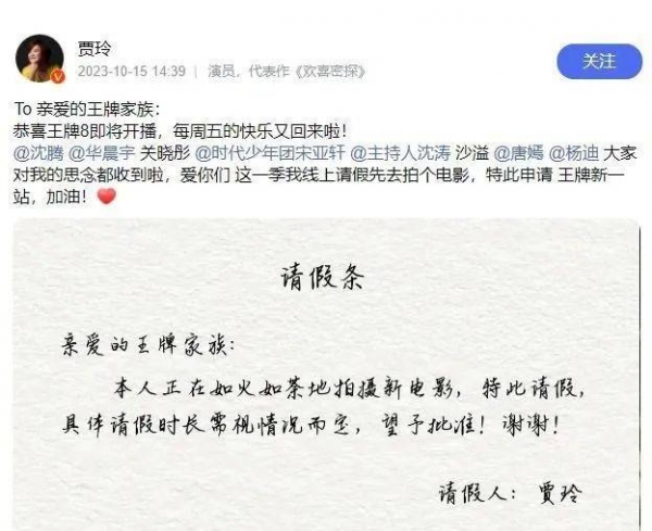 贾玲还特意推掉了常驻的《王牌对王牌》第八季,并且给录制组写了假条,表示自己为拍摄新电影需要长期请假。