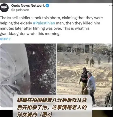 近日,以色列一起令人震惊的事件在加沙地带发生。一张照片显示,一名以色列士兵正帮助一位巴勒斯坦老人,但在拍摄结束后,他们却从老人的背部开了两枪,将他无情地打死。