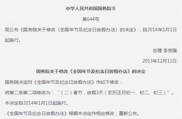 其实,按照《全国年节及纪念日放假办法》的规定,春节的法定假期只有3天,那就是农历正月初一、初二、初三。