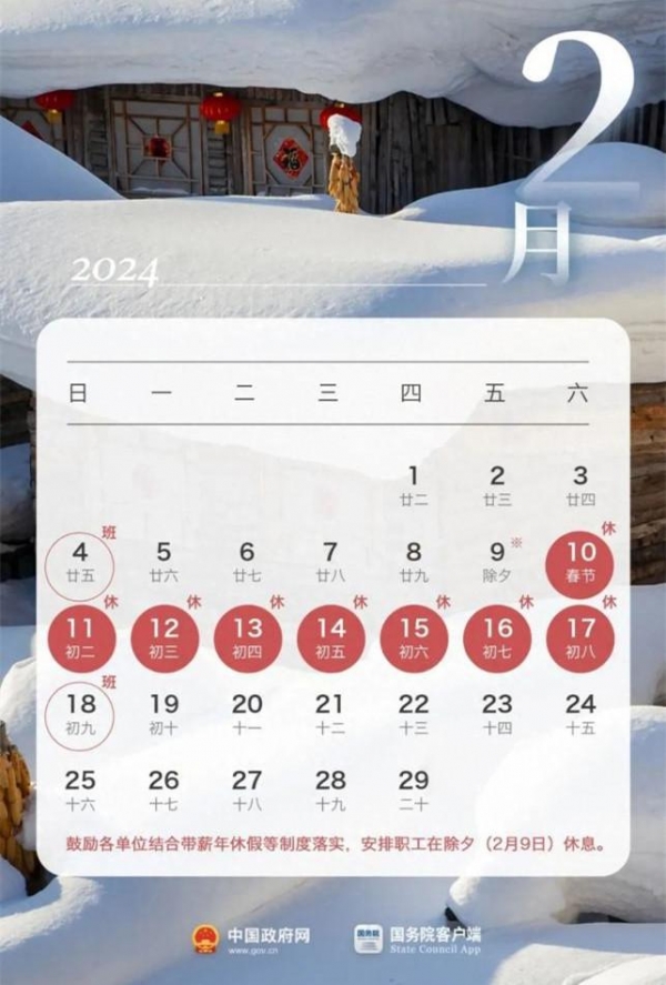 《通知》精神为,2024年春节放假调休日期的具体安排为: