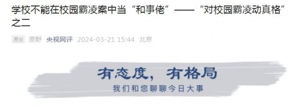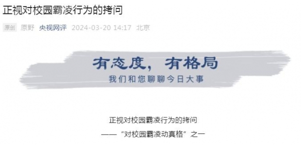面对当下的校园霸凌频现,央视网评连续两天发文,正视对校园霸凌行为的拷问。痛批:校园霸凌出现高度危险苗头!该动真格了!特别有必要通过对标志性事件的案例剖析和正确处理形成示范和震慑效应。