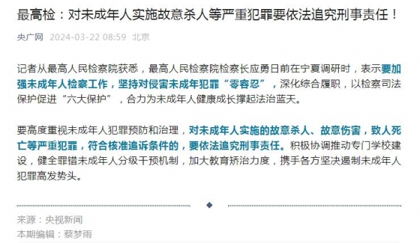 3月22日,最高检发声:对未成年人实施的故意杀人、故意伤害,致人死亡等严重犯罪,符合核准追诉条件的,要依法追究刑事责任。