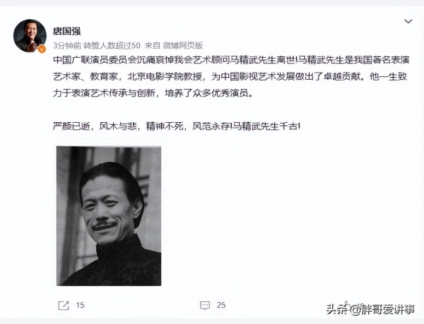 娱乐圈又传噩耗,电影教育家、表演艺术家、导演艺术家,北京电影学院表演系教授马精武老师因病离世,享寿86岁。